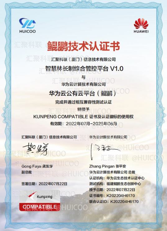 匯聚科聯自主研發(fā)的“智慧林長制綜合管控平臺1.0”與華為云計算技術有限公司的華為云公有云平臺(鯤鵬)完成并通過相互兼容性測試認證,正式獲得華為鯤鵬技術認證書